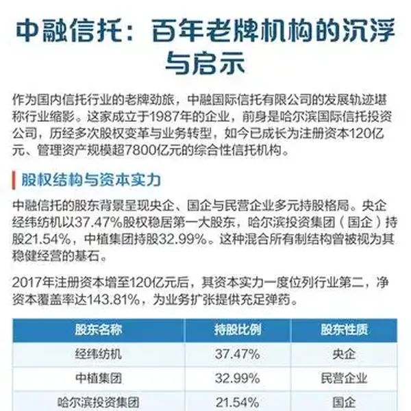 2002年,一个关键年份,中植集团加入国企行列,完成了对中融信托的重组,并成功获得了信托牌照,这标志着其资本运作的正式开始。在此过程中,中植集团先是收购了那些面临融资困境的公司,掌握了它们的控制权,接着又推出了高收益的理财产品。到了2010年,央企经纬纺机成为了中融信托的最大股东,随后公司持续增资扩股。到了2014年,信托资产管理的规模已经超过了7000亿元,并且还获得了“受托境外理财业务资格”的批准。
